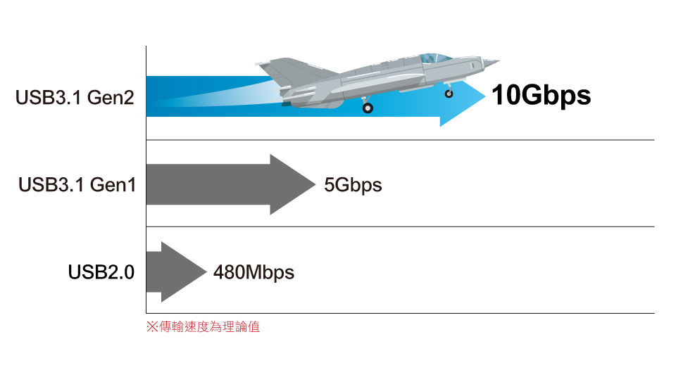 採用 USB Type-C 傳輸介面,符合 USB 3.1 Gen 2 規格,支援最高 10 Gbps 傳輸速度(理論值) |