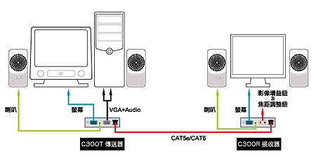 使用一條 CAT5e 纜線作連接,影音訊號最遠可以延長距離 300 公尺 。 |